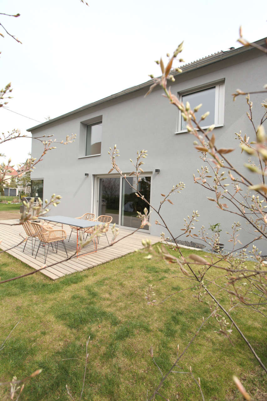 eine durchgehende treppe, bildet mit dem gegenüberliegendem luftraum den räumlichen komplexen zusammenhalt des wohnhauses und verbindet die ebenen und ermöglicht spannende blickbeziehungen.