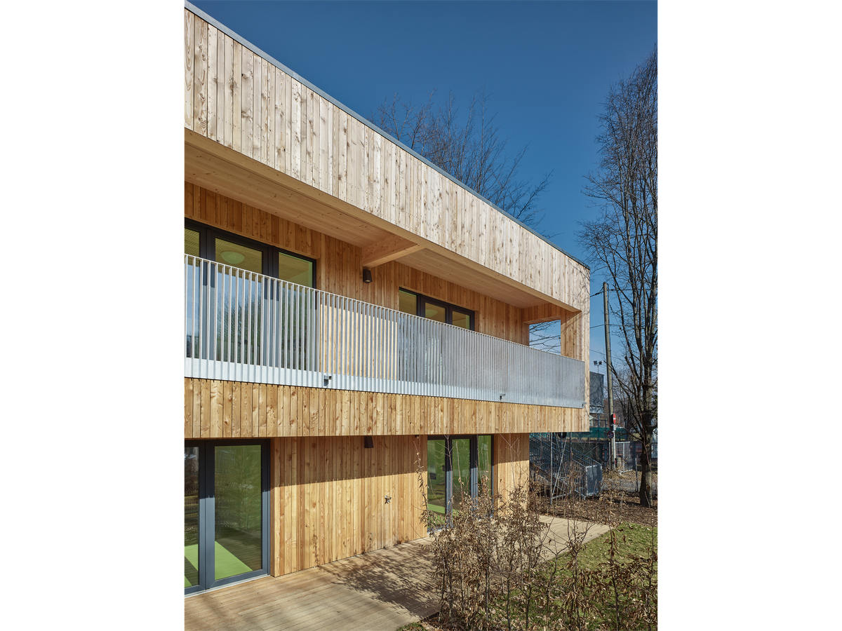 der kindergarten umreißt einen klar geformten, zweigeschossigen baukörper, der sich konsequent nach süden zum außenbereich öffnet, als solitär im sport-park waldau. in seiner ästhetik klar, zeichnet die holzfassade den ruhigen bau als kubus nach. diese klarheit gibt dem kindergarten in einem heterogenen umfeld von sportbauten eine eigene identität.